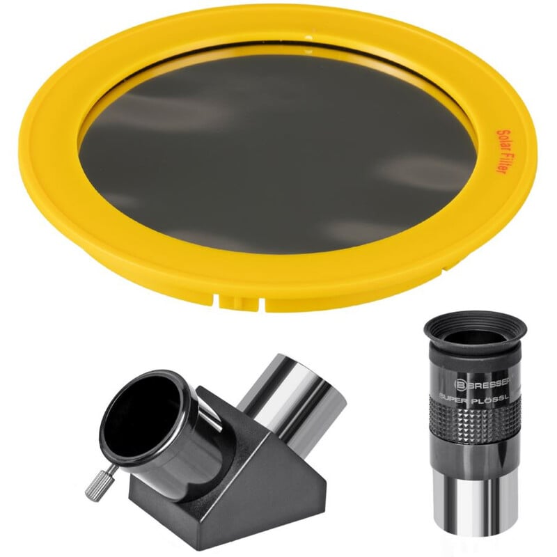 Inbegrepen en gebruiksklaar De telescoop wordt geleverd met oculairs, zenitspiegel en zonnefilter — alles wat je nodig hebt om meteen te starten. Het roestvrijstalen statief zorgt voor een stabiel beeld, zonder trillingen tijdens het scherpstellen