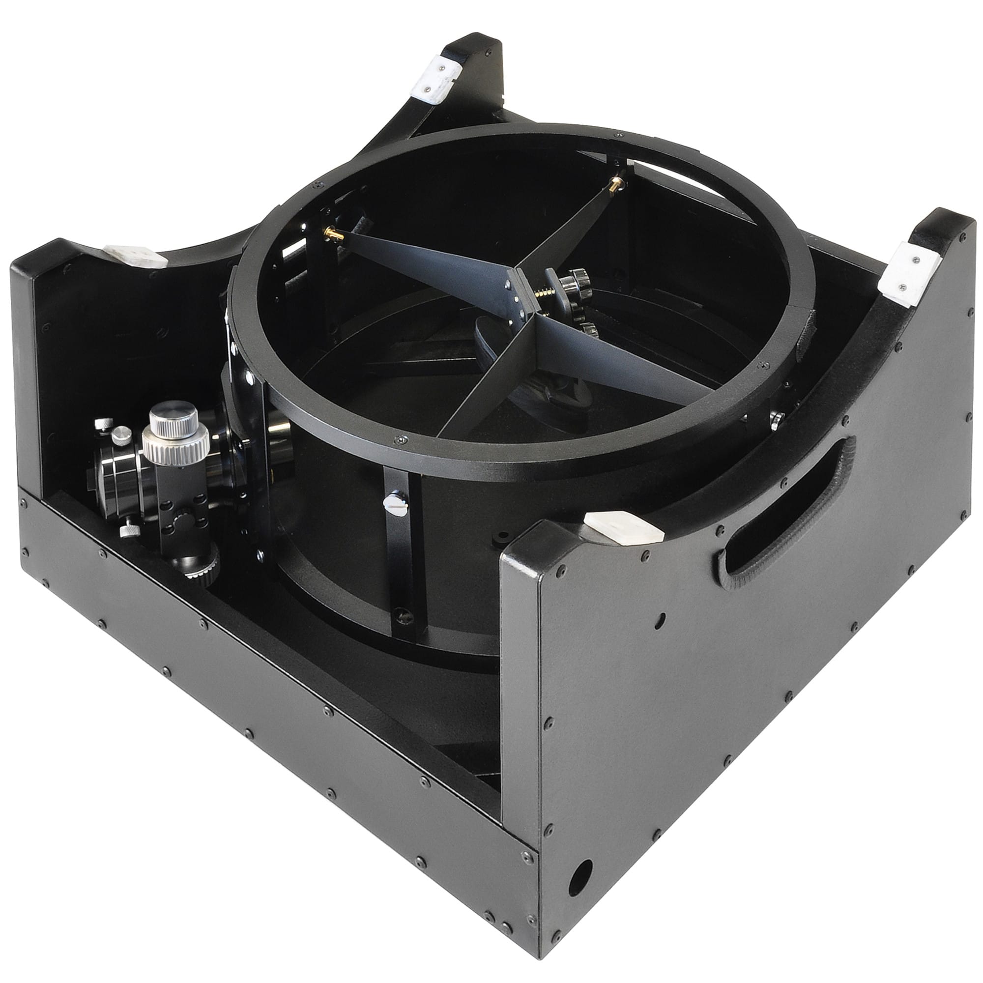De telescoop is bovendien volledig gebouwd uit metaal – geen hout, geen vochtproblemen. De vangspiegelspin kan zonder gereedschap worden verwijderd en de hoofdspiegel is van voren afstelbaar. Alle onderdelen zijn ontworpen voor snel op- en afbouwen. De hoogtewielen, bovenkooi en trussbuizen passen netjes in de Rockerbox, waardoor de telescoop in slechts twee aluminium koffers past.