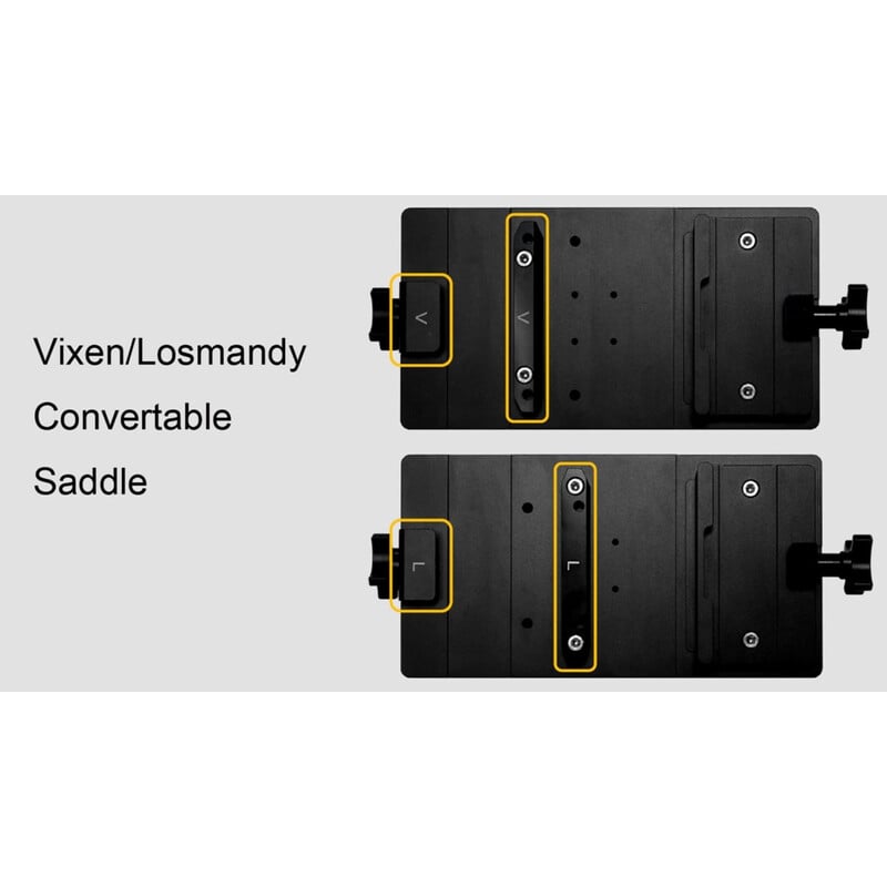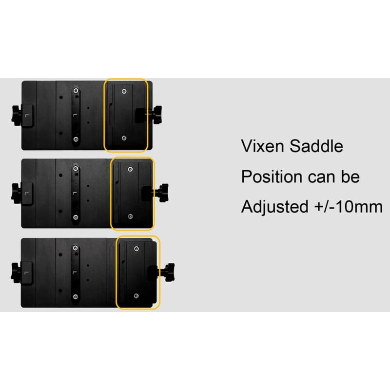 iOptron Sideres Plaat wordt geleverd met CNC-gefreesde dubbele klem, verstelbare Vixen- en Losmandy-zadels en schuifplaat – ideaal voor nauwkeurige balans en zij-aan-zij montage.