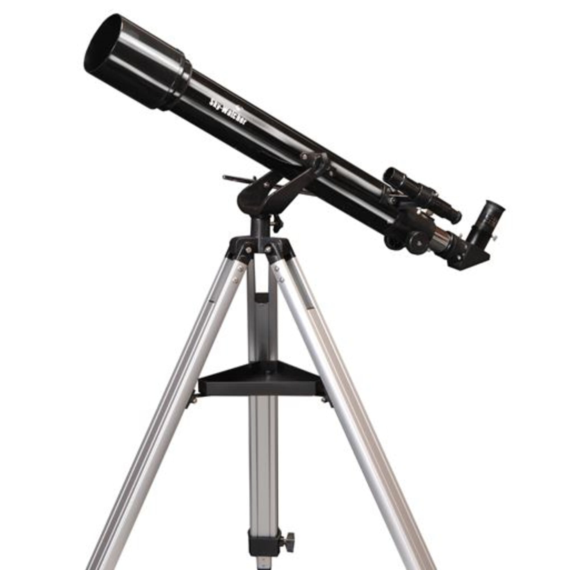 Skywatcher Telescoop AC 70/700 Mercury AZ-2 wordt geleverd met 70 mm refractoroptiek, 25 mm en 10 mm oculairs, 2x Barlow-lens, 90° zenitspiegel, 6×24 zoeker en een stabiel aluminium statief met AZ-2 montering.