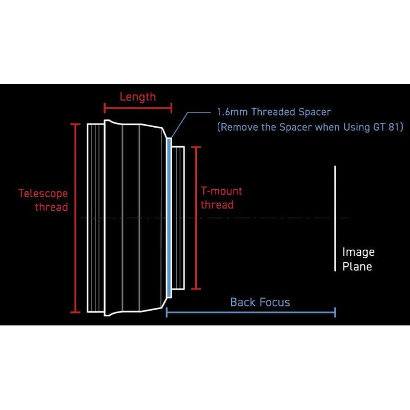 De Flat GT is geschikt voor de WO GranTurismo 71 & 81. Hij heeft een M63-telescoop aansluiting en M48-cameraaansluiting. Dankzij de compacte 22 mm lengte blijft je opstelling licht en stabiel. Met twee lenzen in één groep krijg je een egaal gecorrigeerd beeldveld van 44 mm, ideaal voor astrofotografie.