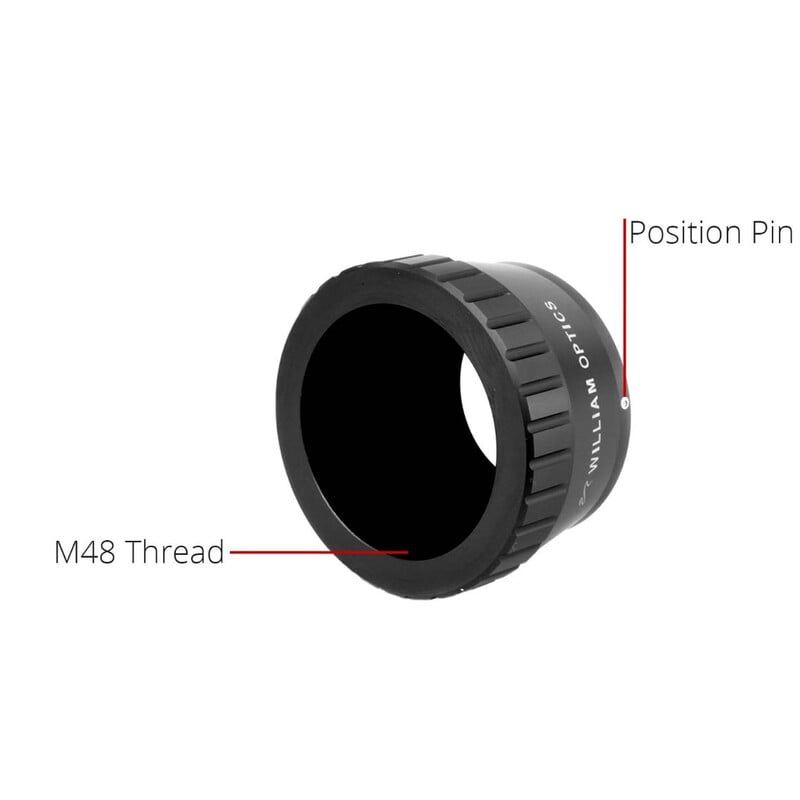 The William Optics FX 48mm adapter maakt het makkelijk om je Fuji X-camera aan je telescoop te koppelen. Je klikt hem vast, draait hem in de M48-aansluiting en je kunt meteen fotograferen. Alles voelt stevig en precies, zodat je beelden helder en strak blijven.