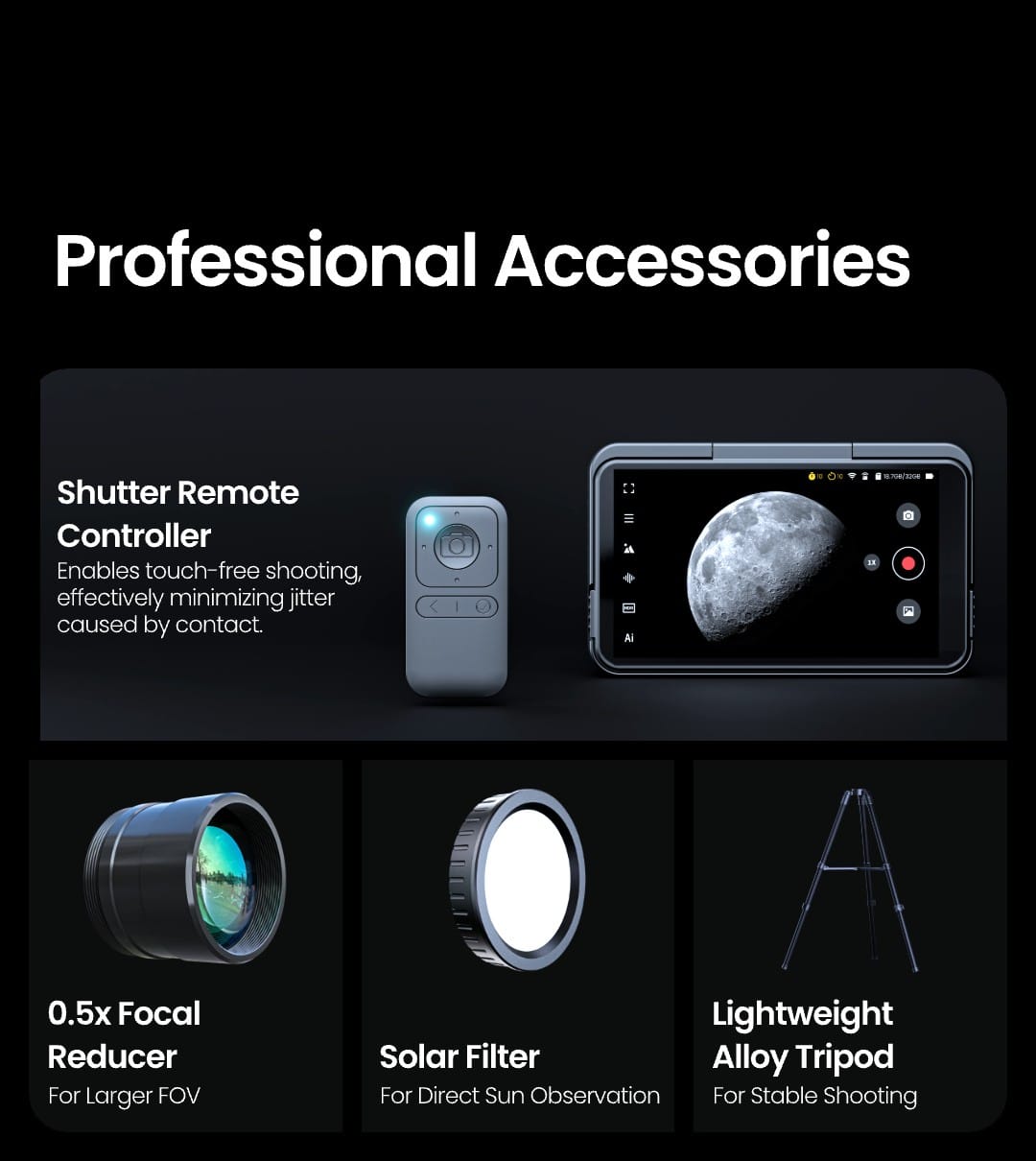 - Nauwkeurig sterrenzoeksysteem: Snelle en precieze scherpstelling op hemellichamen.