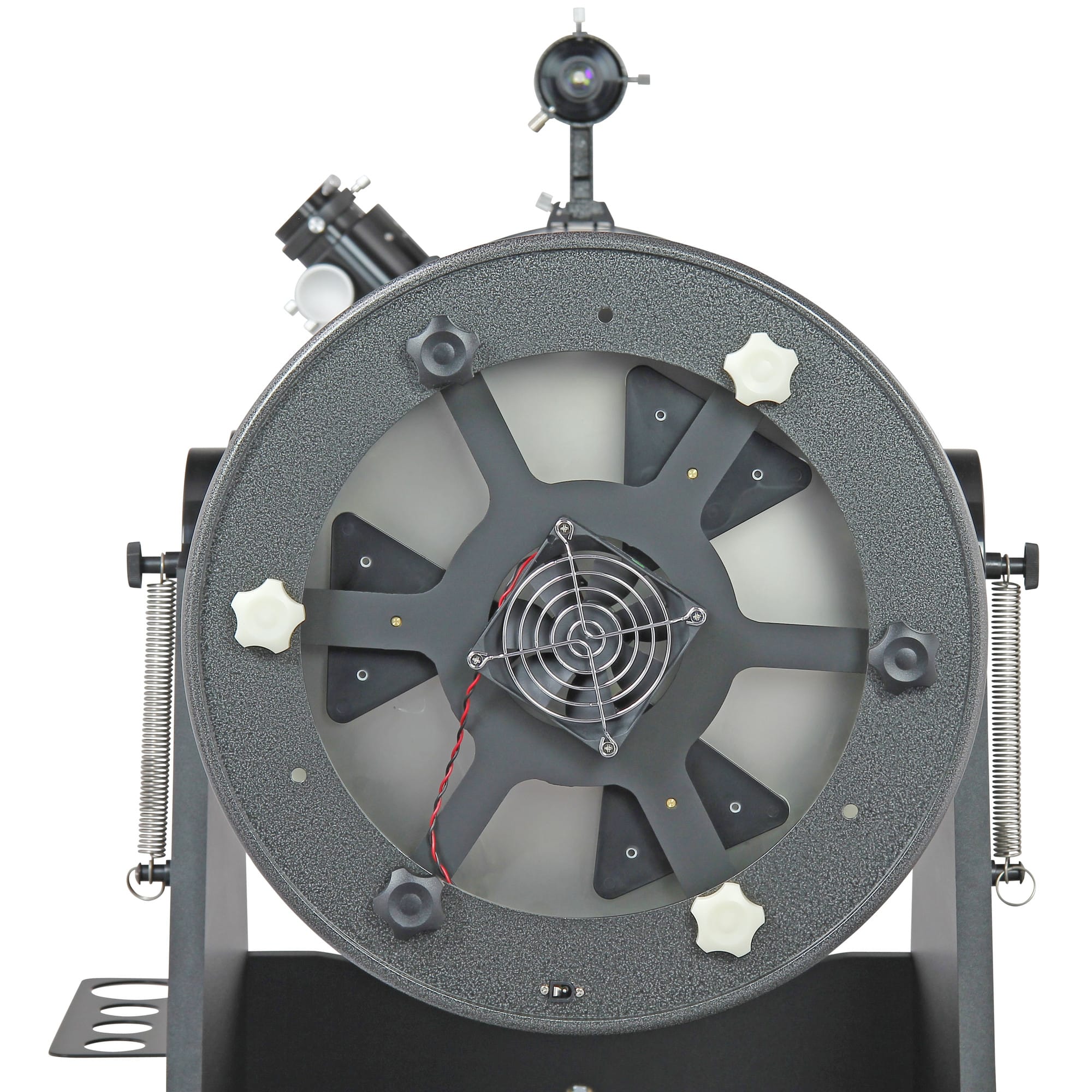 De stabiele Dobson-montering met Teflon-lagers en spanveren maakt soepele bewegingen mogelijk en houdt de buis stevig in balans. Dankzij de Crayford-focuser stel je uiterst nauwkeurig scherp, zelfs bij hoge vergrotingen. Een geïntegreerde ventilator onder de hoofdspiegel versnelt de afkoeling, zodat je snel een stabiel beeld hebt.