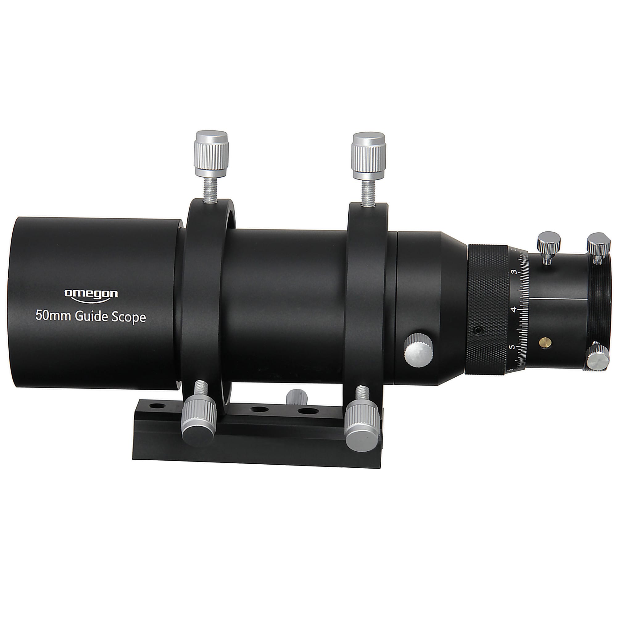 Omegon Microspeed Guidescope 50 mm wordt geleverd met buisringen, zwaluwstaart en Microspeed-wormwielfocuser.
