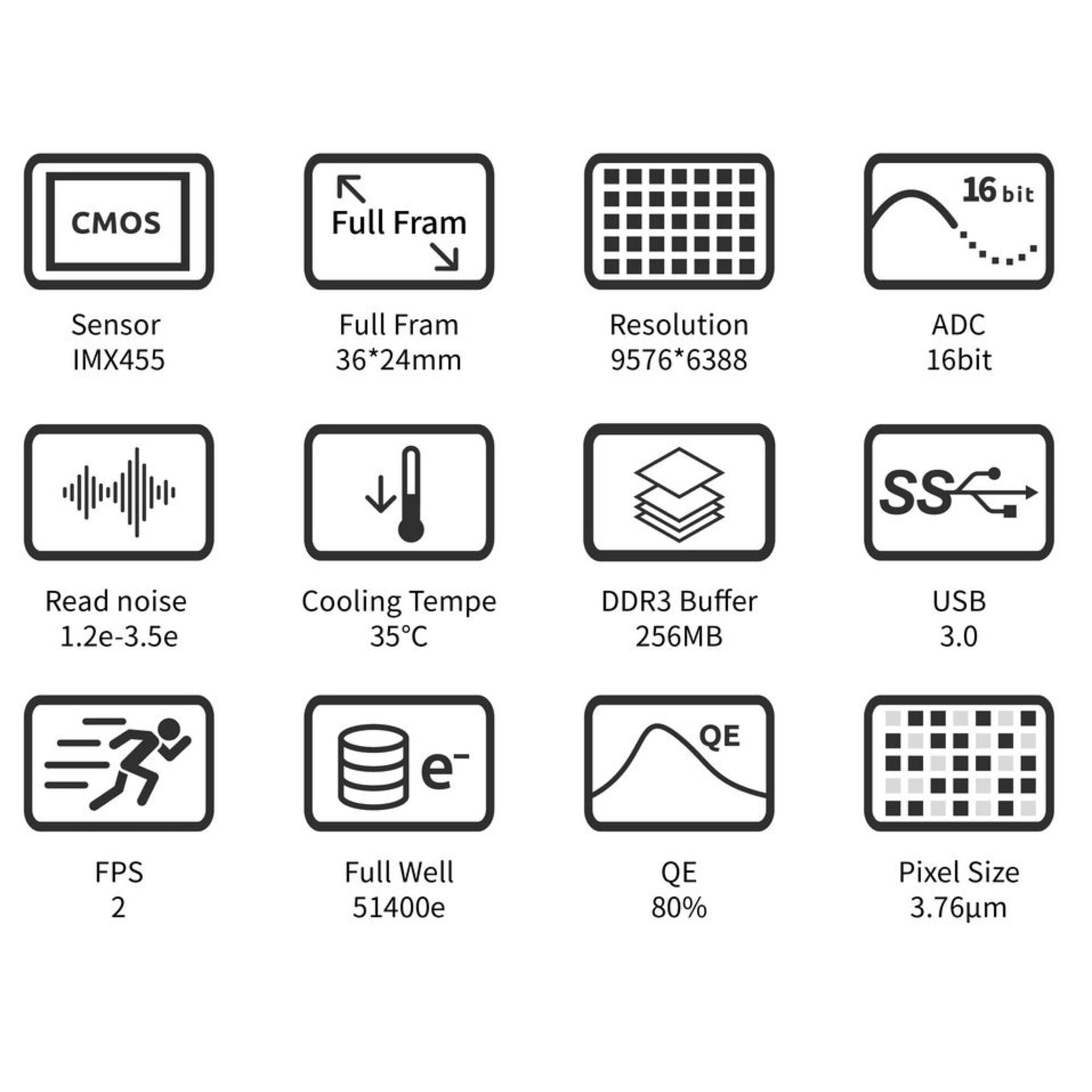 ✓ Deep-sky astrofotografie (nevels, sterrenstelsels, clusters) ✓ Widefield-opnames met full-frame telescopen en lenzen ✓ Maan- en planeetfotografie met extreem veel detail ✓ Infrarood- en smalbandopnamen met volledige controle ✓ Wetenschappelijke toepassingen dankzij 16-bit precisie