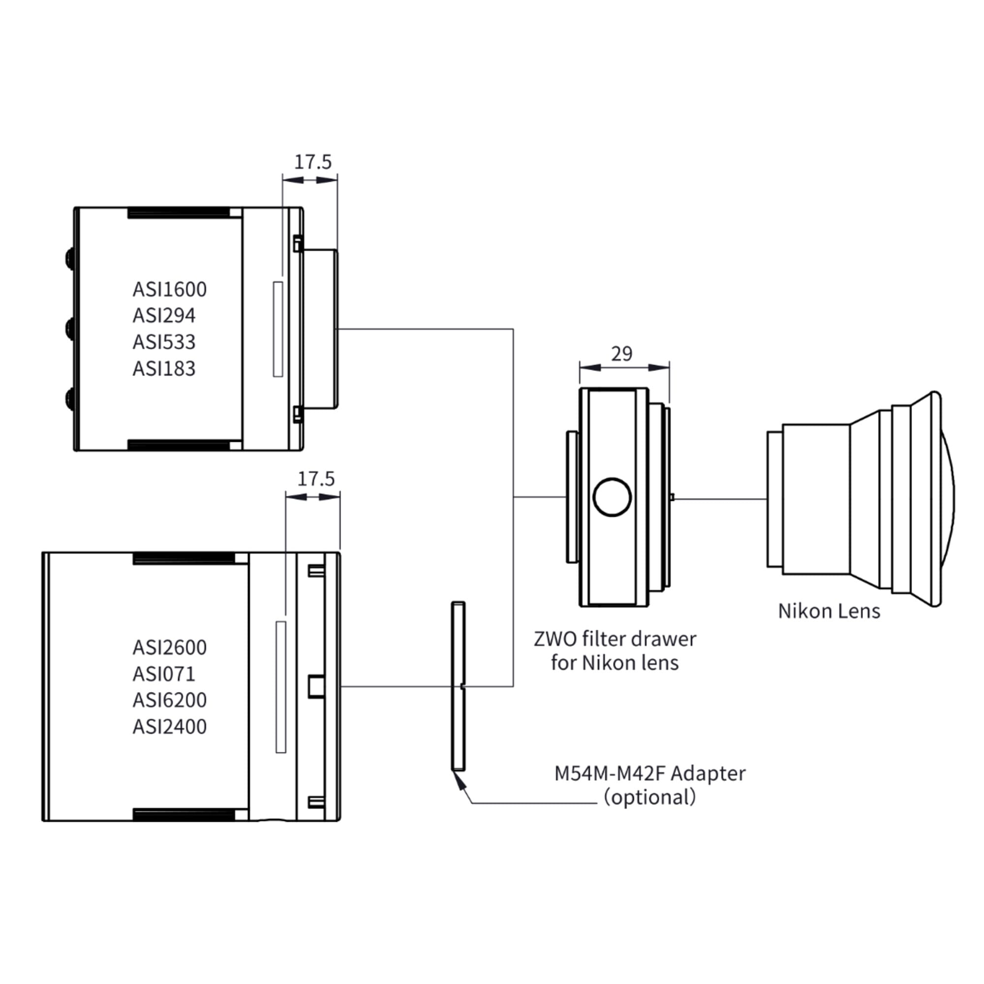✓ Compatibel met Nikon F-objectieven en ZWO ASI-camera’s (werkafstand 17,5 mm)