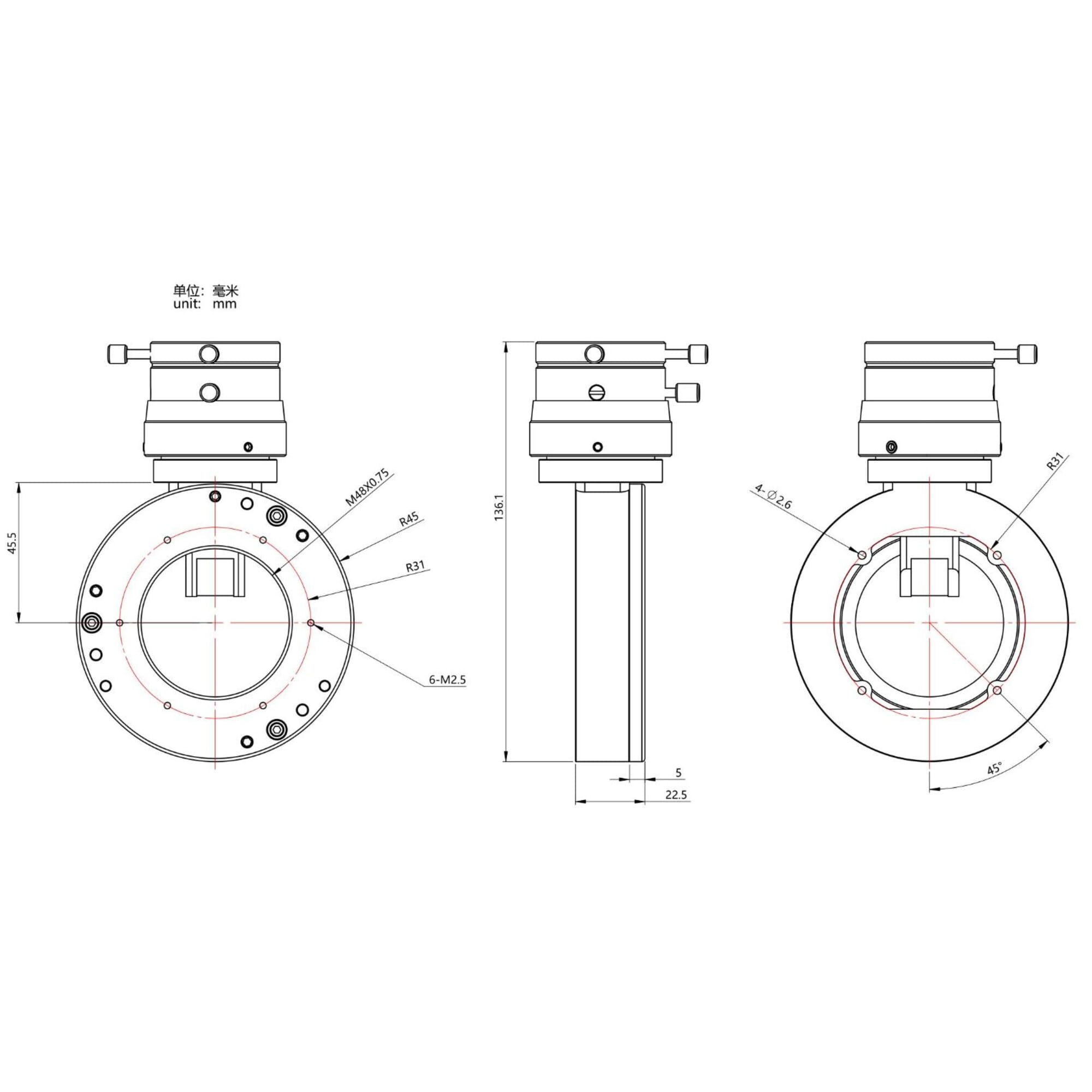 De OAG-L is geoptimaliseerd voor gebruik met het ZWO EFW filterwiel en full-frame ASI-camera’s, met een optische opbouw van exact 55 mm (OAG + EFW + gekoelde camera). De meegeleverde kanteladapter (M48) maakt het mogelijk om de beeldhoek exact uit te lijnen met je sensor voor perfect vlakke astrofoto’s.